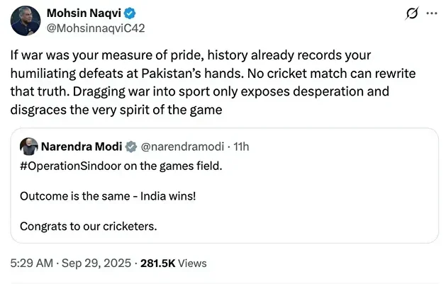 جس کے جواب میں محسن نقوی نے لکھا کہ اگر آپ کو جنگ پر فخر ہے تو پاکستان کے ہاتھوں آپ کی ذلت آمیز شکست تاریخ کا حصہ ہے۔ کوئی کرکٹ میچ اس حقیقت کو دوبارہ نہیں لکھ سکتا۔ جنگ کو کرکٹ میں گھسیٹنا مایوسی کا اظہار اور سپرٹ آف گیم کی توہین ہے۔