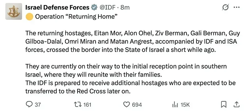 اسرائیلی فوج نے اپنے ایک بیان میں کہا ہے کہ سات یرغمال اسرائیل کی سرزمین میں داخل ہو چکے ہیں جنہیں ابتدائی طور پر ایک استقبالیہ مرکز پر لے جایا جا رہا ہے جہاں ان کی اہلِ خانہ سے ملاقات کرائی جائے گی۔