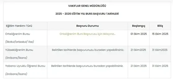 Vakıflar Genel Müdürlüğü (VGM), 2025-2026 eğitim yılı üniversite burs başvuru takvimini resmi internet sitesi üzerinden paylaştı. Kurumun internet sitesi üzerinden açıklanan takvime göre, ilköğretim, ortaöğretim ve lise öğrencilerine verilen ortaöğretim burs başvuruları 15 Ekim saat 23:59’a kadar alınacak. Ortaöğrenim busrs başvurularının tamamlanması ardından yükseköğrenim burs başvuru süreci başlatılacak.