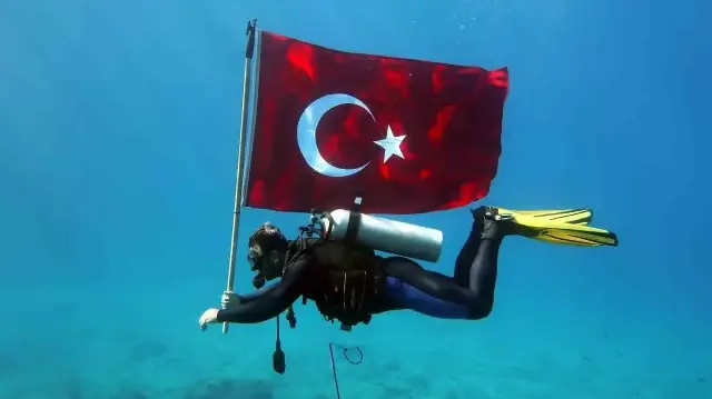 Fethiye'deki Dalış Merkezi, 29 Ekim Cumhuriyet Bayramı'nı unutulmaz bir şekilde kutladı. Dalyan Koyu'nda gerçekleştirilen etkinlikte, dalgıçlar 5 metre derinlikte Türk bayrağını su altına taşıyarak Cumhuriyet'in 102. yılını coşkuyla kutladı.