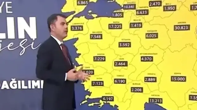 Çevre, Şehircilik ve İklim Değişikliği Bakanı Murat Kurum, dar gelirli vatandaşlar için 500 bin sosyal konutun satışa sunulacağı Yüzyılın Konut Projesi kapsamında 81 ildeki konut dağılımını TRT Haber ekranlarında katıldığı canlı yayında, harita üzerinde açıkladı.