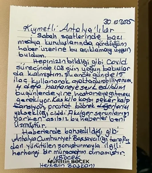 Böcek'in açıklamasında, "Kıymetli Antalyalılar sabah saatlerinde bazı medya kuruluşlarında gördüğüm haber üzerine bu açıklamayı yapmayı uygun buldum. Hepinizin bildiği gibi Covid sürecinde 108 gün yoğun bakımda kalmıştım. Şu anda günde 15 ilaç kullanarak ayakta durabiliyorum. 4 defa hastaneye sevk edildim. Bugünlerde yine hastaneye gitmem gerekiyor. Kas kilo kaybı şeker kalp tansiyon, prostat, böbrek değerlerim yüksekliği ciddi. Akciğer sorunlarım varken asılsız bu haberler beni üzmüştür. Haberlerde bahsedildiği gibi Antalya Cumhuriyet Başsavcılığı tarafından yürütülen soruşturmayla ilgili herhangi bir müracaatım olmamıştır" ifadeleri yer aldı.