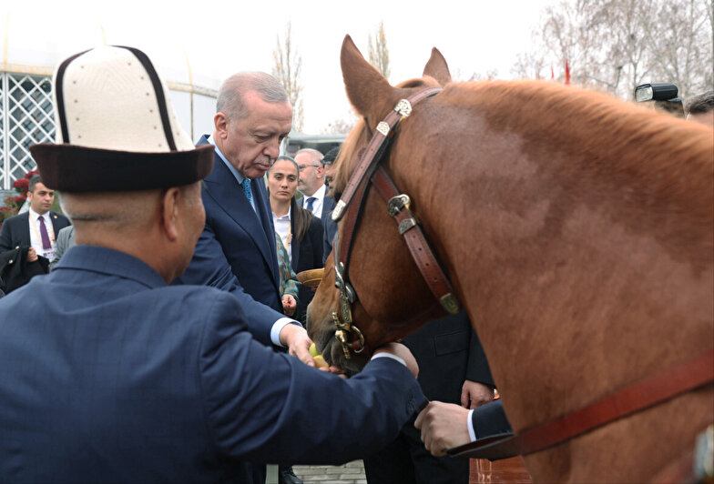 Kırgızistan Cumhurbaşkanı Sadır Caparov ise, Cumhurbaşkanı Erdoğan'a Kırgız atı hediye etti. Cumhurbaşkanı Erdoğan ve eşi Emine Erdoğan hediye edilen atı besledi.