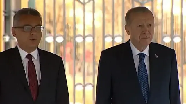 Cumhurbaşkanı Recep Tayyip Erdoğan, Kuzey Kıbrıs Türk Cumhuriyeti (KKTC) Cumhurbaşkanı Tufan Erhürman’ı Cumhurbaşkanlığı Külliyesi’nde resmi törenle karşıladı. Atlı birliklerin eşlik ettiği konuk Cumhurbaşkanı Erhürman, tören alanında “Merhaba asker” diyerek kıtayı selamladı. 21 pare top atışı ve İstiklal Marşı eşliğinde başlayan törende, tarihteki 16 Türk devletini temsil eden bayraklar da yer aldı. Erdoğan ve Erhürman, karşılıklı heyetlerini tanıtarak iki ülke bayrakları önünde basın için poz verdi. İki lider daha sonra baş başa görüşmeye geçti. Törende Cumhurbaşkanı Yardımcısı Cevdet Yılmaz, İletişim Başkanı Burhanettin Duran ve Ankara Valisi Vasip Şahin de hazır bulundu.