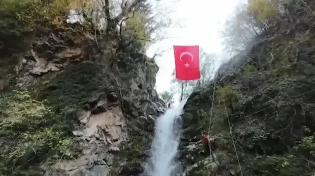 Giresun Doğa Sporları Kulübü (GİDOSK) üyeleri, Cumhuriyet Bayramı coşkusunu doğanın kalbine taşıyarak unutulmaz bir etkinliğe imza attı. Dağcılar, zorlu bir tırmanışın ardından 40 metrelik Büyük Şelale'ye dev Türk Bayrağı astı. Olay, Dereli ilçesine bağlı Akkaya Deresi’nde bulunan ve yaklaşık 40 metre yüksekliğindeki Büyük Şelale’de gerçekleşti. GİDOSK üyeleri, Cumhuriyet Bayramı’nı farklı ve anlamlı bir şekilde kutlamak için harekete geçti. Zorlu parkurda profesyonelce iple iniş gerçekleştiren dağcılar, inişin tamamlanmasının ardından özenle hazırlanan Türk Bayrağı'nı şelalenin en çarpıcı noktasına astı. Etkinlik, Cumhuriyet Bayramı ruhunu doğa sporlarının adrenaliniyle birleştirirken, şelalenin sularına yansıyan ay yıldızlı bayrağın ihtişamlı görüntüsü drone ile kaydedildi. Dağcılar, bu etkinlikle Cumhuriyet coşkusunu zirveye taşıdıklarını gösterdi.