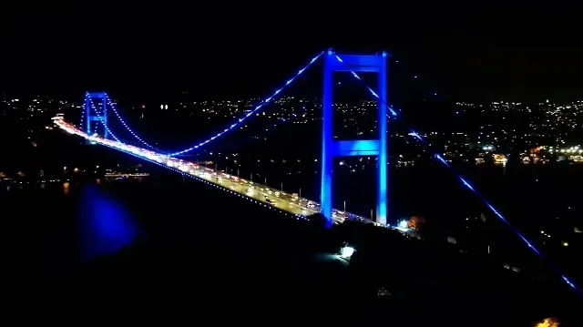 Dünya Denizcilik Günü dolayısıyla İstanbul Boğazı’nın iki dev geçişi Fatih Sultan Mehmet (FSM) ve Yavuz Sultan Selim köprüleri mavi ışıklarla aydınlatıldı. Boğaz’ın iki yakasını buluşturan köprülerin büyüleyici manzarası dron ile görüntülendi. Her yıl denizcilik faaliyetlerinin önemine dikkat çekmek amacıyla kutlanan "Dünya Denizcilik Günü" kapsamında köprüler gece boyunca mavi ışıklarla süslendi. Renklerin yansımasıyla Boğaz’da eşsiz bir manzara ortaya çıktı. Havadan çekilen görüntülerde iki köprünün de mavi ışıklarla bütünleşen İstanbul silueti izleyenlere görsel şölen sundu.