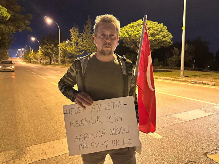 “Ben şu an burada Filistin Gazze’de yaşanan zulme karşı yürüyüş yapıyorum. Bu düşünce 2 aydan beri benim aklımda vardı, eşimle, dostumla paylaştım. Artık halkın harekete geçmesi gerekiyor. Ben basit bir insanım, esnafım ama ben 2 aydır evimde rahat uyuyamıyorum, yemek yiyemiyorum. Artık yeter, bu İsrail’i kim durduracak? Eğer Avrupa ve Amerika durduramıyorsa, kimseler durduramıyorsa halk olarak bizler durduralım. Savaş için değil, barış için yürüyelim. Bizim amacımız İsrail’e gidip de savaşmak değil ama bu mazlum insanları niye öldürüyor? Bu insanlar ne yaptı? İbrahim Peygamber’e karınca tarafından taşınan suyun hikayesini herkes biliyor, anlatmaya gerek yok. Ben de o misal elime un aldım, bu yazıyı da yazdım. Karınca misali bu unu, Allah nasip ederse Filistinli kardeşlerime, Gazze’deki kardeşlerime temsili olarak götüreceğim. Belki bu bir işe yaramayabilir ama Türkiye’de 86 milyon nüfusumuz var. 10 milyon insan benimle beraber Suriye sınırına şu kadar un getirse ve bu Netanyahu denilen alçak şu 10 milyon Türk’ü, Müslüman’ı veya vicdan sahibi insanı görünce bir barış imzalasın artık. O da farkına varsın”