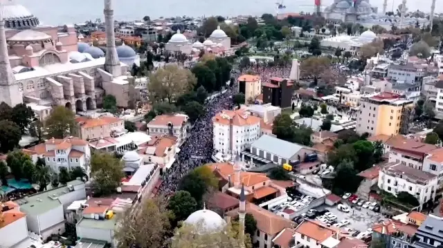 On binlerce İstanbullu İHH ve Filistin'e Destek Platformunca, İsrail'in Gazze'deki soykırımına karşı durmak ve ablukayı delmek amacıyla yola çıkan Uluslararası Özgürlük Filosu'na destek için düzenlenen yürüyüşe katılarak Ayasofya Meydanı'ndan Eminönü Meydanı'na yürüdü.