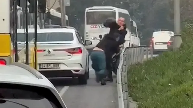 İstanbul Kağıthane’de motosikletli ile otomobil sürücüsü arasında yol verme tartışması kavgaya dönüştü. O anlar cep telefonu kamerasıyla saniye saniye görüntülendi. Emniyet Evleri Mahallesi’nde trafikte ilerleyen iki sürücü arasında yol verme meselesi nedeniyle tartışma çıktı. Kısa sürede büyüyen gerginlik, kavgaya dönüştü. Motosiklet sürücüsü kaskıyla saldırırken, otomobil sürücüsünün yumruk attığı görüldü. Çevredeki vatandaşların şaşkın bakışları arasında yaşanan arbedede, sürücülerden biri bariyerlerin üzerinden düşerek yaralanma tehlikesi geçirdi. Kavga anı çevredeki bir vatandaş tarafından cep telefonu kamerasıyla kaydedildi. Görüntülerde, iki sürücünün trafikte tartıştığı, kaskla vurduğu ve bir kişinin bariyerlerden düştüğü anlar yer aldı.
