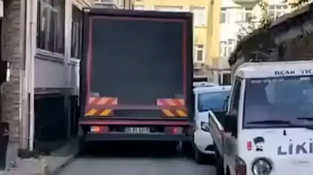 İstanbul’da bir kamyonet sürücüsü, bir tarafına araçların park ettiği dar sokaktan geçmeye çalıştı. Yola sığmayan araç, bazen kaldırıma çıkarak, bazen de park halindeki araçlara çarparak yoluna devam etti.
