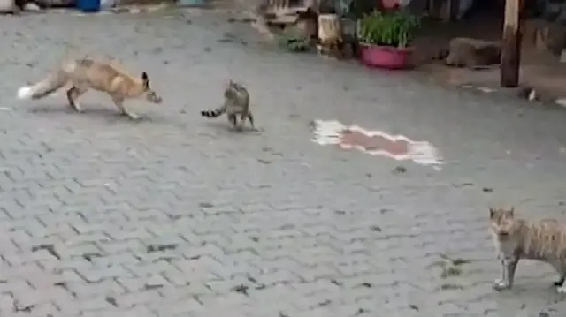 Bolu’nun Göynük ilçesinde köye inen bir tilki, evin önündeki kedilerle oyun oynarken cep telefonu kamerasına yansıdı. Dağşeyhler köyünde yaşayan Mehmet Çalışkan, sabah saatlerinde evinin bahçesine giren tilkiyi fark etti. Kedilerle yan yana duran tilkinin saldırmak yerine onlarla oynamaya başladığını gören Çalışkan, o anları cep telefonuyla kayda aldı. Görüntülerde, tilkinin kedilere yaklaşarak zıpladığı, kedilerin de korkmak yerine oyunlarına karşılık verdiği görülüyor. İlginç anlarda tilkinin, kendisine verilen ekmeği yemek yerine kedilerle oynamayı tercih ettiği anlar da yer aldı. Bir süre bahçede kedilerle vakit geçiren tilki, daha sonra evin çevresinden ayrılarak arazide gözden kayboldu.