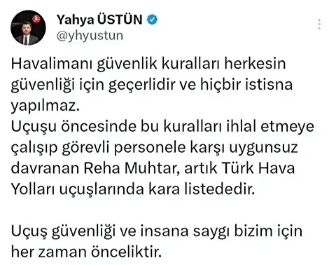 Üstün açıklamasında, "Havalimanı güvenlik kuralları herkesin güvenliği için geçerlidir ve hiçbir istisna yapılmaz. Uçuşu öncesinde bu kuralları ihlal etmeye çalışıp görevli personele karşı uygunsuz davranan Reha Muhtar, artık Türk Hava Yolları uçuşlarında kara listededir. Uçuş güvenliği ve insana saygı bizim için her zaman önceliktir" ifadelerini kullandı.
