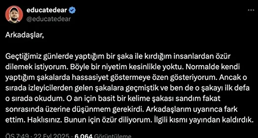 Soydemir, X hesabından yaptığı paylaşımda, yaptığının 'şaka' olduğunu belirtip özür diledi. "Geçtiğimiz günlerde yaptığım bir şaka ile kırdığım insanlardan özür dilemek istiyorum." diyen Soydemir, "Böyle bir niyetim kesinlikle yoktu. Normalde kendi yaptığım şakalarda hassasiyet göstermeye özen gösteriyorum. Ancak o sırada izleyicilerden gelen şakalara geçmiştik ve ben de o şakayı ilk defa o sırada okudum. O an için basit bir kelime şakası sandım fakat sonrasında üzerine düşünmem gerekirdi. Arkadaşlarım uyarınca fark ettim. Haklısınız. Bunun için özür diliyorum. İlgili kısmı yayından kaldırdık." ifadelerini kullandı.