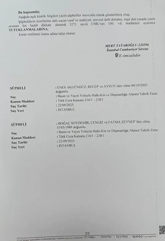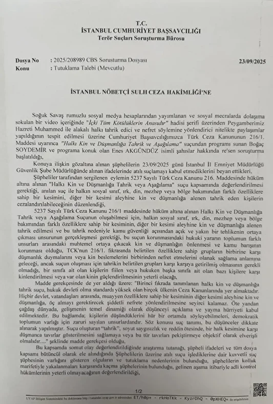 İstanbul Cumhuriyet Başsavcılığı, söz konusu paylaşım nedeniyle Türk Ceza Kanunu’nun 216/1. maddesi uyarınca “Halkı kin ve düşmanlığa tahrik veya aşağılama” suçundan re’sen soruşturma başlattı.