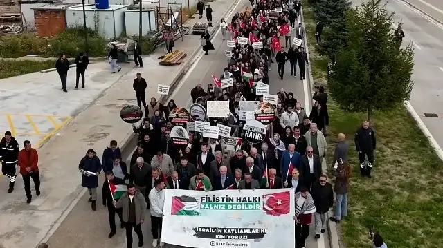Uşak'ta İsrail'in Filistin'e saldırılarını protesto etmek amacıyla "Gazze için umut, insanlık için kardeşlik yürüyüşü" düzenlendi. Uşak Üniversitesi Öğrenci Toplulukları ve Türkiye Gençlik Vakfı (TÜGVA) Uşak İl Başkanlığı koordinesindeki yürüyüşe akademisyenler ve öğrenciler katıldı. Bir Eylül Kampüsü'ndeki rektörlük binası önünde toplanan grup, sloganlarla sosyal tesislerin bulunduğu alana yürüdü. "Filistin halkı yalnız değildir, İsrail'in katliamlarını kınıyoruz" yazılı pankart açan katılımcılar, Türk ve Filistin bayraklarının yanı sıra "Filistin'e destek, Siyonizme lanet", "Çocuklar ölürken susulmaz", "Filistin'deki insanlık suçuna dur de", "Özgür Kudüs için ayağa kalk", "Soykırıma göz yumma" yazılı dövizler taşıdı. Grup adına açıklama yapan üniversite öğrencisi Mehmet Ulakçı, İsrail'in Filistin'e yönelik saldırılarında binlerce çocuk, kadın ve sivilin hayatını kaybettiğini söyledi. Ulakçı, Filistin'de bir soykırım yapıldığını, İsrail tarafından abluka altına alınan Gazze'ye gıda ve ilaç gibi temel yardım malzemelerinin de erişiminin engellendiğini ifade etti. Filistinlilerin insanca yaşama haklarının elinden alındığını kaydeden Ulakçı, "Ülke yönetimleri ve uluslararası kuruluşlar, Gazze'de yaşanan zulmü görmeyecek kadar kör, duymayacak kadar sağır ve bunu dile getiremeyecek kadar basiretsiz." dedi. Açıklamanın ardından Kur'an-ı Kerim okundu, dua edildi. Yürüyüşe, Uşak Üniversitesi Rektörü Prof. Dr. Ekrem Savaş, AK Parti İl Başkanı Himmet Yaşar, AK Parti İl Gençlik Kolları Başkanı İsmet Özkan ve TÜGVA İl Temsilcisi Hüseyin Bıyıklı da katıldı.