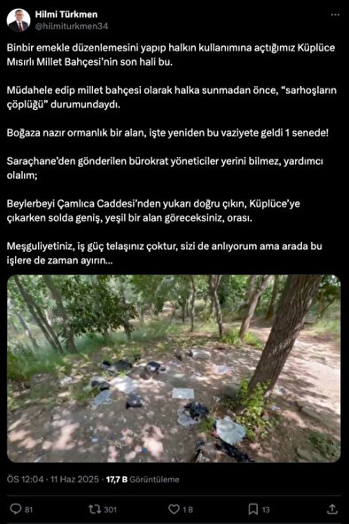 İstanbul Üsküdar’da bulunan “Küplüce Mısırlı Millet Bahçesi”, CHP’nin yerel seçimlerde belediyeyi kazanmasının ardından adeta kaderine terk edildi. Vatandaşların nefes aldığı, çocukların oyun oynadığı yeşil alan, son görüntüsüyle hayal kırıklığı yarattı. Bakımsızlıktan dolayı otlar metrelerce uzarken, yerlere saçılmış çöpler ve alkol şişeleri dikkat çekti. 2014-2024 yılları arasında Üsküdar Belediye Başkanlığı görevini yürüten ve millet bahçesini ilçeye kazandıran AK Partili Hilmi Türkmen, tepkisini sosyal medyada paylaştığı videoya eklediği notla dile getirdi. Türkmen, “Binbir emekle düzenlemesini yapıp halkın kullanımına açtığımız Küplüce Mısırlı Millet Bahçesi’nin son hali bu. Müdahale edip millet bahçesi olarak halka sunmadan önce, sarhoşların çöplüğü durumundaydı. Boğaza nazır ormanlık bir alan, işte yeniden bu vaziyete geldi bir senede!” ifadelerini kullandı. Türkmen, CHP’li yeni yönetimin ilgisizliğine vurgu yaparak, “Saraçhane’den gönderilen bürokrat yöneticiler yerini bilmez, yardımcı olalım: Beylerbeyi Çamlıca Caddesi’nden yukarı doğru çıkın, Küplüce’ye çıkarken solda geniş, yeşil bir alan göreceksiniz, orası. Meşguliyetiniz, iş güç telaşınız çoktur, sizi de anlıyorum ama arada bu işlere de zaman ayırın…” diyerek sitem etti. 2018 yılında Hilmi Türkmen döneminde hizmete açılan Küplüce Mısırlı Millet Bahçesi, Üsküdar halkının uzun yıllar doğayla buluştuğu önemli bir sosyal alan olmuştu. Ancak 2024 yerel seçimlerinin ardından CHP’ye geçen belediyenin ilgisizliği sonucu alanın yeniden eski, bakımsız haline dönmesi tepkilere neden oldu. Sosyal medyada paylaşılan görüntülerde vatandaşlar da duruma isyan etti.