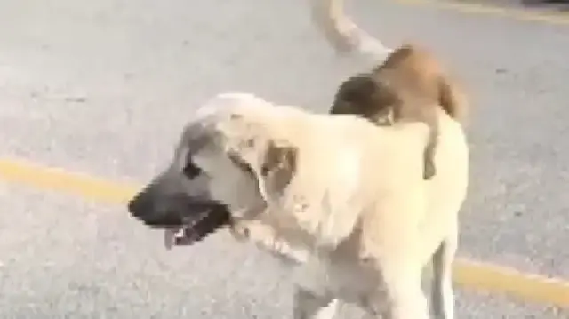 Bursa Uludağ Yolu’nda yürüyen vatandaşlar, bir sokak köpeğinin sırtına çıkıp, ona sarılarak gezen maymunu görünce o anları cep telefonu kamerasıyla görüntüledi.