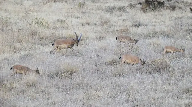 Hakkari'de koruma altındaki dağ keçileri, kentin girişine yakın noktada dronla görüntülendi. Dağlık coğrafyasıyla yaban hayvanlarına ev sahipliği yapan kentte, son zamanlarda koruma faaliyetleriyle yaban keçilerinin popülasyonu arttı. Hakkari'nin birçok noktasında sürüler halinde dolaşan yaban keçileri, kentin girişindeki Sere Solan mevkisindeki yamaçta görüldü. Dronla kaydedilen yaban keçileri, bir süre otladıktan sonra gözden kayboldu.