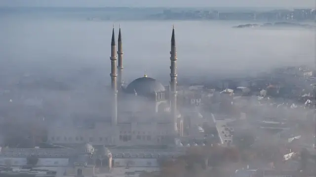 Edirne’de sabah saatlerinde yüksek kesimlerde etkili olan sis, Mimar Sinan’ın şaheseri Selimiye Camii’nin üzerini kaplayarak eşsiz manzaralar oluşturdu. Kentte erken saatlerde beliren sis bulutları, görüş mesafesini olumsuz etkilemezken özellikle yüksek bölgelerde yoğunlaştı. Sis tabakasının Selimiye Camii’nin kubbe ve minarelerini sarması, tarihi yapıyı adeta bulutların içinde bırakmış gibi bir görüntü ortaya çıkardı. Havadan görüntülenen Selimiye Camii, sisle birlikte kartpostallık kareler sundu. Bazı açılardan bakıldığında caminin tamamen sisin içinde kaybolduğu görüldü.