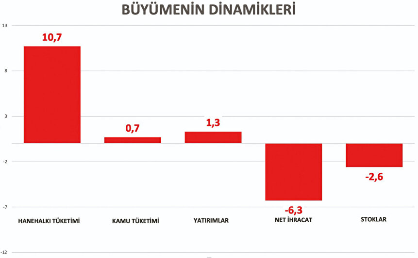 Büyüme verisinin alt kırılımlarına baktığımızda hanehalkı tüketim harcamalarının II. çeyrekte %15,6 arttığını görüyoruz. Bu artışın büyümeye katkısı 10,7 puan olurken kamu tüketiminin büyümeye olan katkısı da 0,7 puan olmuş. Yatırımlardaki artış büyümeye 1,3 puanlık destek sağlarken net ihracattaki gelişmeler büyümenin 6,7 puan düşmesine neden olduğunu görüyoruz. Stoklardaki düşüş de büyümeyi 2,6 puan aşağı çekmiş.