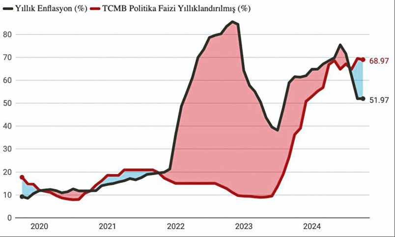 Her ne kadar hanehalkı ve reel sektörün 12 ay sonrası için enflasyon beklentisi henüz istenilen düzeyde çıpalanamamış olsa da Piyasa Katılımcıları Anketi’ndeki beklentiler her ay daha da düşük seviyeye işaret ediyor. Örneğin Ağustos ayında 12 ay sonrası TÜFE beklentisi bir önceki anket döneminde %30,02 iken, bu anket döneminde %28,71 oldu. Bu bakımdan basit bir “reel faiz” hesabıyla bile beklenen enflasyona göre ciddi bir reel faiz verildiği görülüyor. Dahası ve belki de en önemlisi şu an %50 olan politika faizinin yıllıklandırılmış seviyesi %68,97 seviyesine işaret ederken Ağustos ayı enflasyon verisi %51,97. Yani hali hazırda gerçekleşen enflasyona göre de önemli bir reel faiz veriliyor.