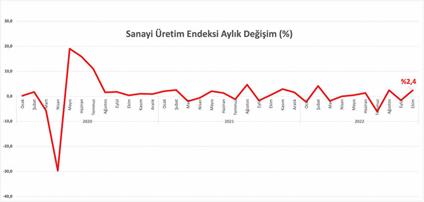 TÜİK’in Ekim ayı verilerine göre Sanayi Üretim Endeksi bir önceki aya göre %2,4 artarken yıllık bazdaki artış da %2,5 oldu. Sanayinin alt sektörlerinde ise madencilik ve taşocakçılığı sektörü endeksinin bir önceki aya göre %7,8 ve elektrik, gaz, buhar ve iklimlendirme üretimi ve dağıtımı sektörü endeksinin de %2,1 azaldığını görüyoruz. İmalat sanayii sektörü ise %2,5 artmış durumda.