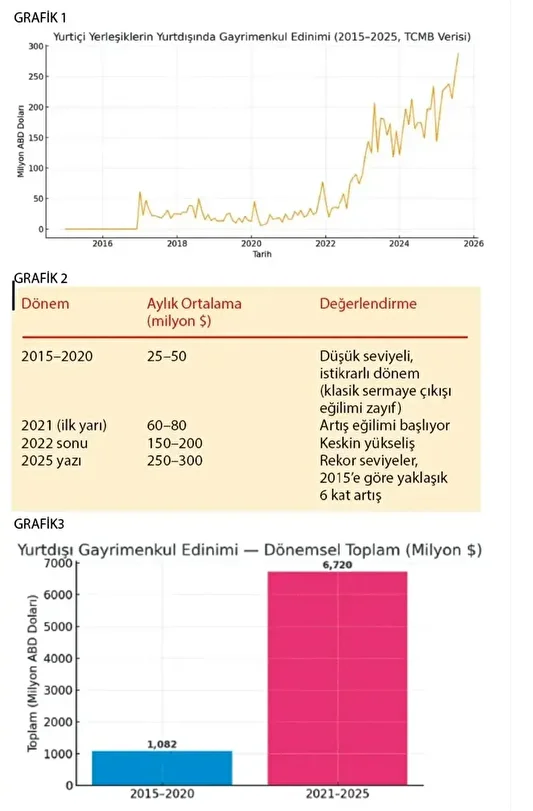 * 2015–2025 toplamında, yurtiçi yerleşiklerin yurtdışında gayrimenkul edinimi yaklaşık 7,8 milyar dolar olmuştur.