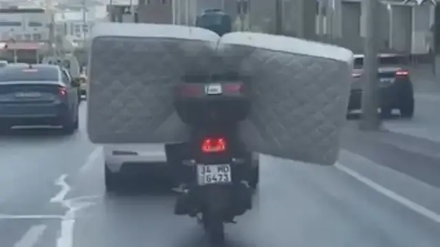 E5'de motosikletiyle yatak taşıyan sürücü kameraya yansıdı