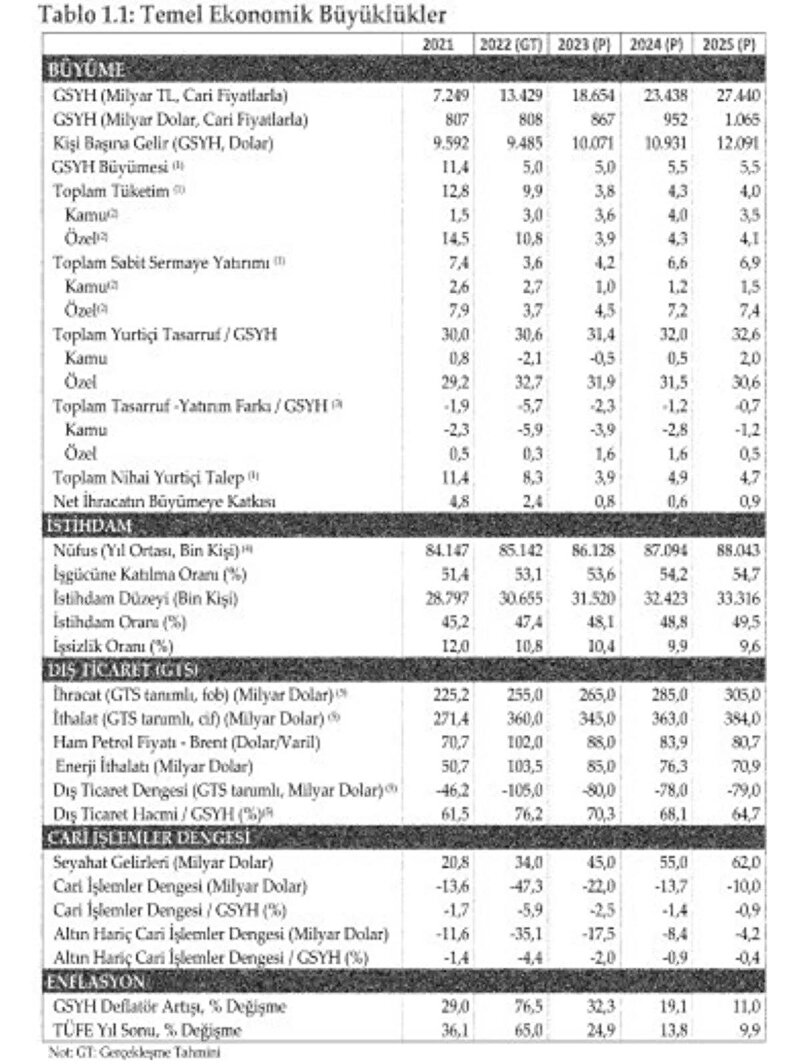 2022 enflasyon hedefi yüzde 65 oldu. Enflasyon hedefi 2023'te yüzde 24,9, 2024'te yüzde 13.8, 2025'te yüzde 9,9 olacak.