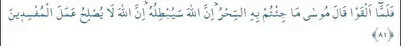 Fe lemmâ elkav kâle Mûsâ mâ ci'tumbihis sihr (sihru), innallâhe se yubtiluhu, innallâhe lâ yuslihu amelel mufsidîn (mufsidîne)
