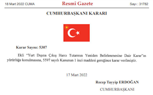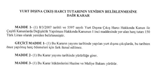 Resmi Gazete'nin bugünkü sayısında Cumhurbaşkanı Recep Tayyip Erdoğan'ın imzasıyla yayımlanan 'Yurt Dışına Çıkış Harç Tutarının Yeniden Belirlenmesine Dair Karar' ile yurt dışına çıkış için alınan harç tutarı 50 TL'den 150 TL'ye yükseltildi.